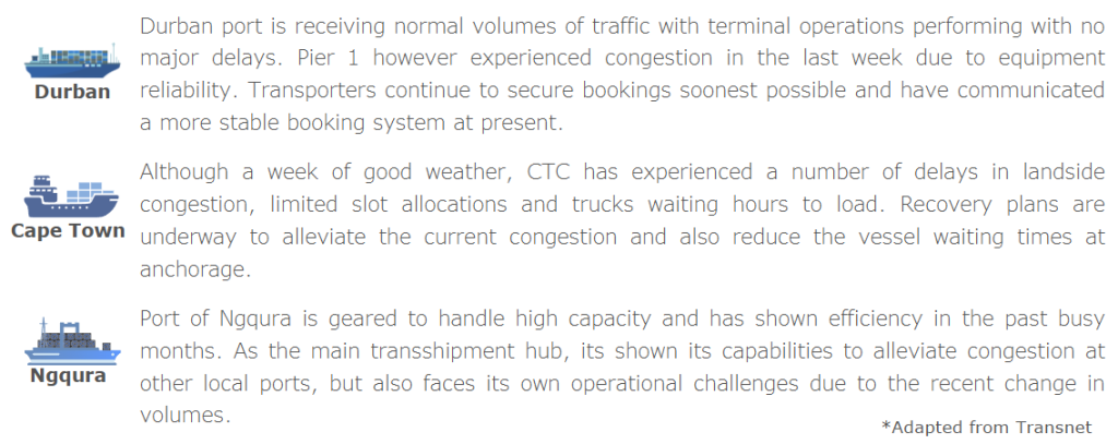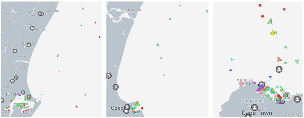 We highlight in these images vessels currently at anchorage pending berth at our three main ports. Port congestion and delays have been reported with Durban at 2 days, Cape Town at 8 days and Coega at 3 days on average.