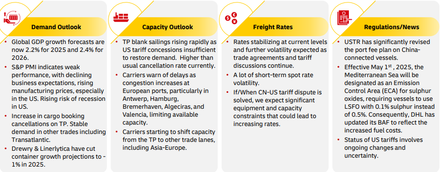 Welcome to the May edition of our Global Logistics Update. While we typically deliver a comprehensive overview once a month now, the dynamic nature of global logistics has prompted an essential mid-month spotlight. Whether you’re managing international shipping, monitoring geopolitical impacts, or navigating new compliance challenges, this update delivers the insights you may need to stay agile and competitive.